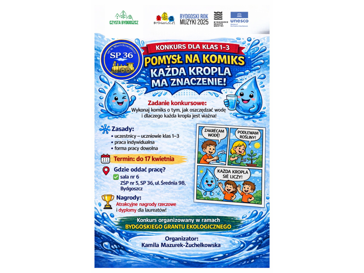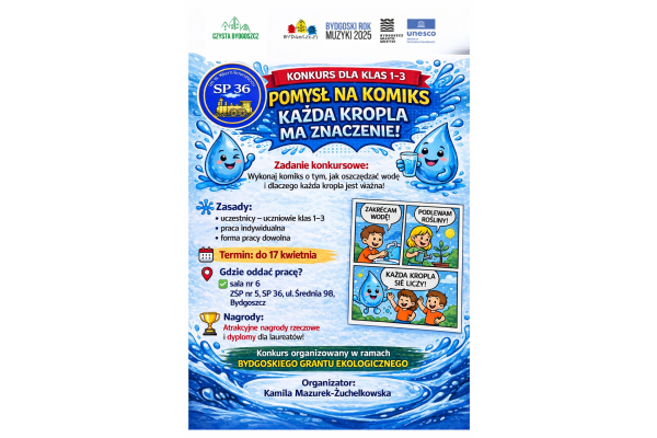 Jednym z elementów projektu jest konkurs dla uczniów klas 1-3: Pomysł na komiks- ,,Każda kropla ma znaczenie". Serdecznie zachęcamy do udziały w konkursie.