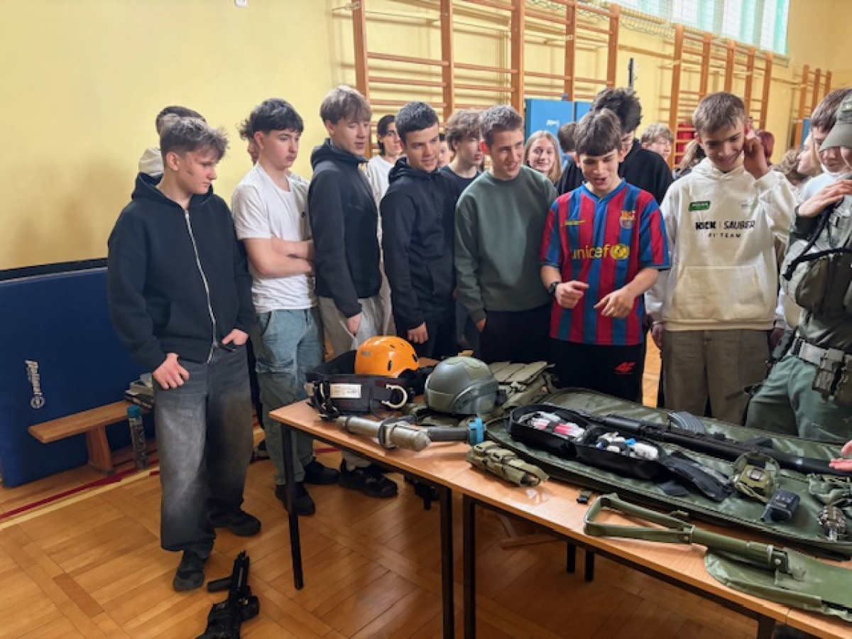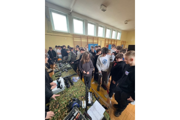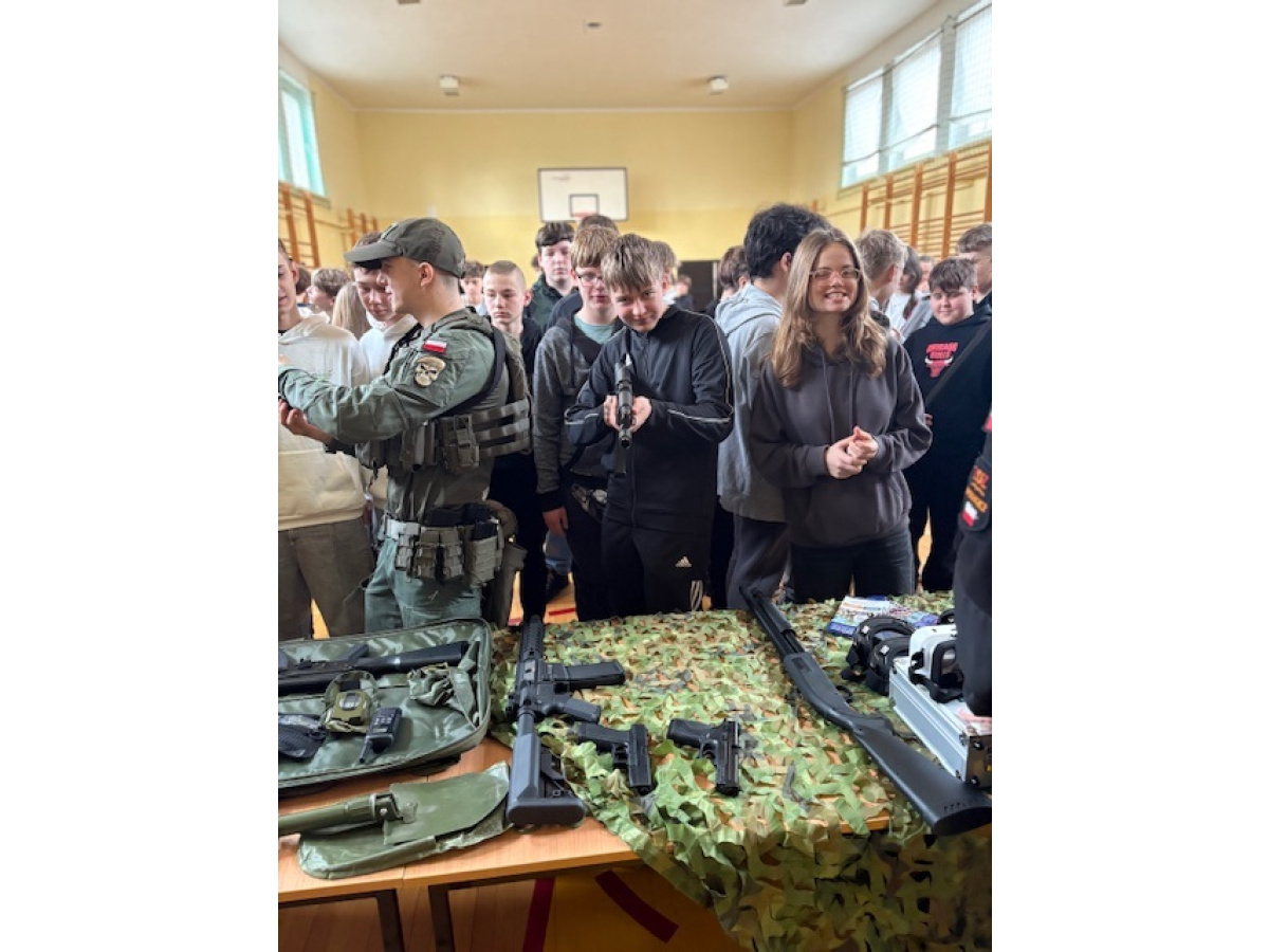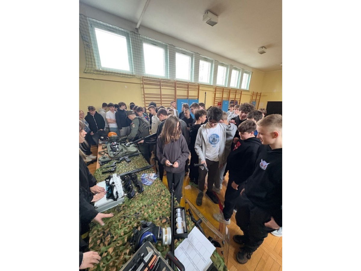 Dużym zainteresowaniem cieszyła się część pokazowa, podczas której uczniowie mogli zobaczyć elementy wyposażenia oraz przykładową broń szkoleniową. Była to ciekawa okazja, aby z bliska poznać specyfikę kierunków związanych m.in. z logistyką i bezpieczeństwem.