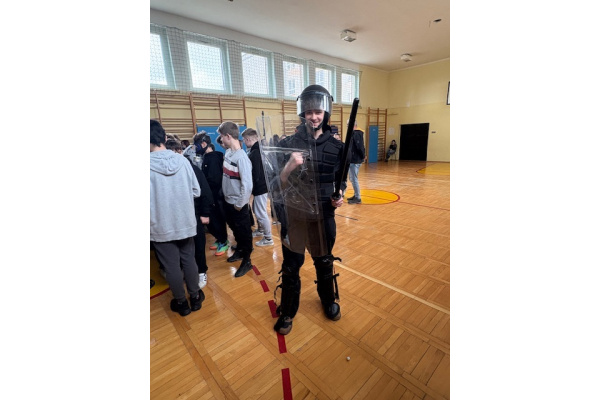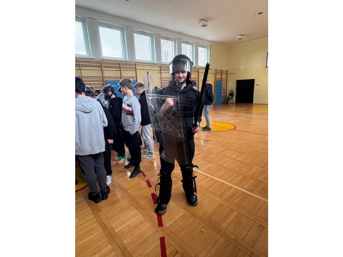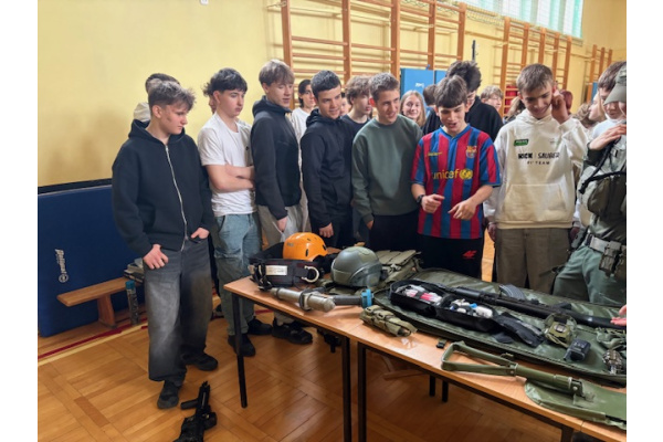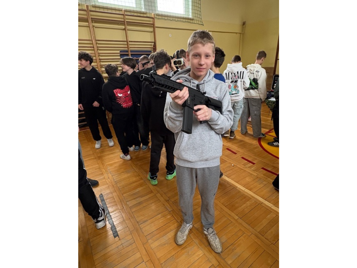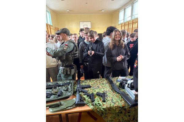 Dużym zainteresowaniem cieszyła się część pokazowa, podczas której uczniowie mogli zobaczyć elementy wyposażenia oraz przykładową broń szkoleniową. Była to ciekawa okazja, aby z bliska poznać specyfikę kierunków związanych m.in. z logistyką i bezpieczeństwem.