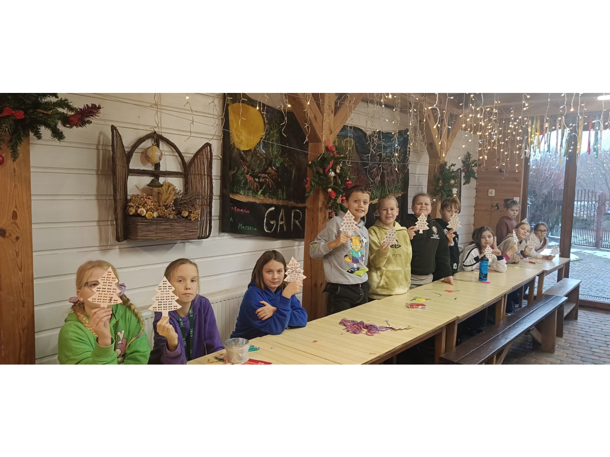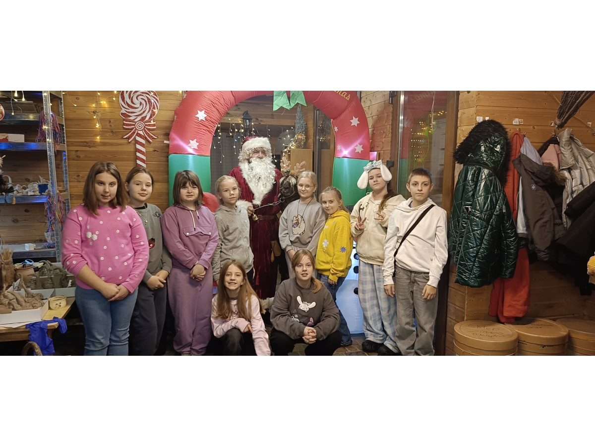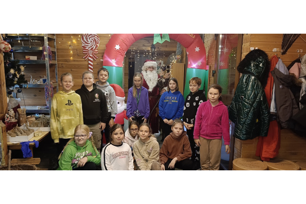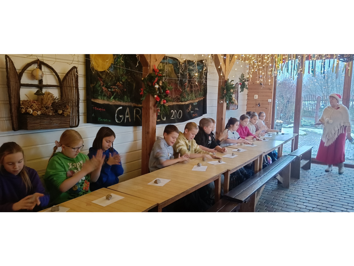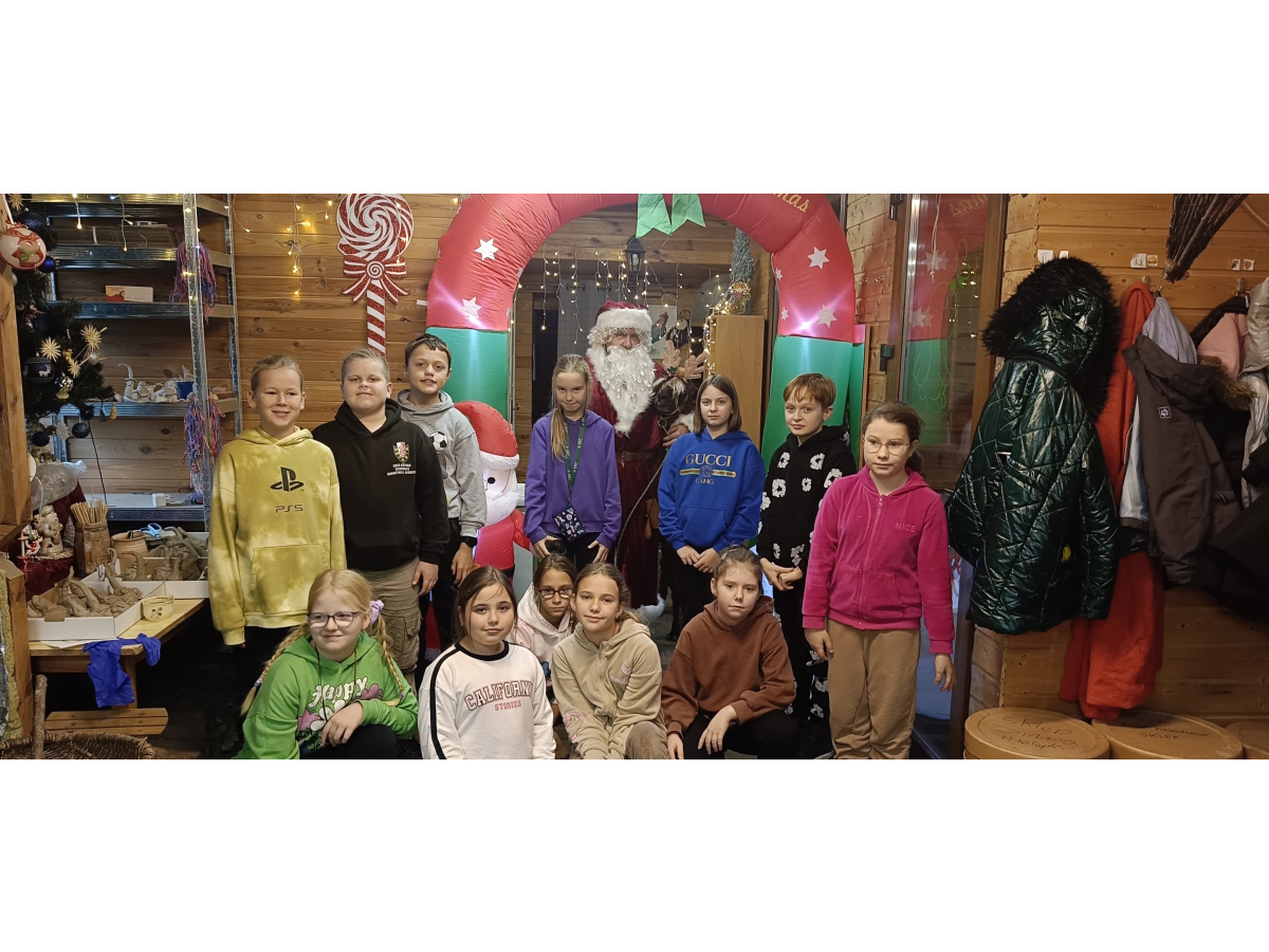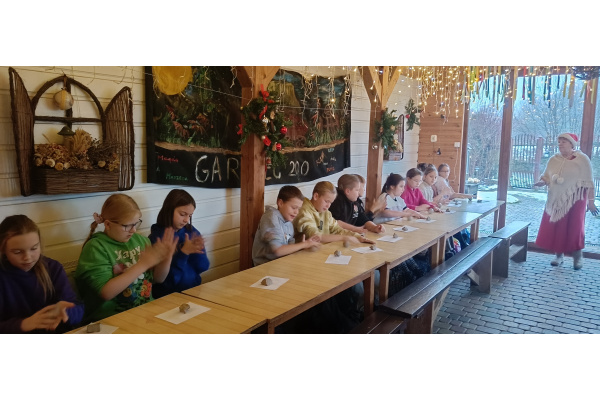 Klasy czwarte odwiedziły Wioskę Ginących Zawodów w Koronowie, gdzie wzięły udział w warsztatach ceramicznych, lepiąc świąteczne skrzaty z białej gliny. Uczniowie spotkali się również z Mikołajem i skosztowali gorących ziemniaczków z parnika babci. Podczas zajęć „Igłą malowane” tworzyli barwne choinki z włóczki, a na zakończenie czekało ognisko z kiełbaskami oraz wesoła zabawa w skansenie. To był dzień pełen radości i świątecznej atmosfery!